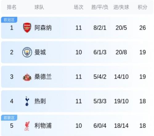 英超第11轮,阿森纳客场2-2战平桑德兰。最新的积分榜方面,枪手7分优势领跑,曼城和桑德兰同积19分,曼城明日凌晨对阵利物浦。热刺、利物浦、伯恩茅斯、曼联四队同积18分。黑马本赛季打出比赛发挥实在出色。